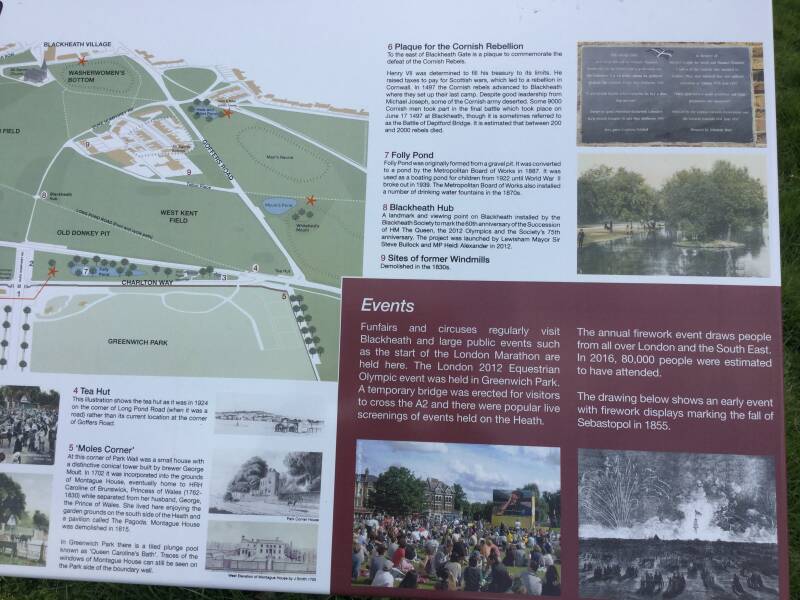 The PESANTS’ REVOLT: WAT TYLER and his supporters, protesting against the POLL TAX, gathered here to meet RICHARD II, in 1381. JOHN BULL gave a rousing, revolutionary sermon (when Adam delved, and Eve span…). In 1450, the rebellious followers of JACK CADE bivouacked here, before entering London with the BLACKHEATH PETITION to air their grievances. CADE was slain and his men returned to the heath “naked save their shirts” to beg the king’s pardon for their outrages.