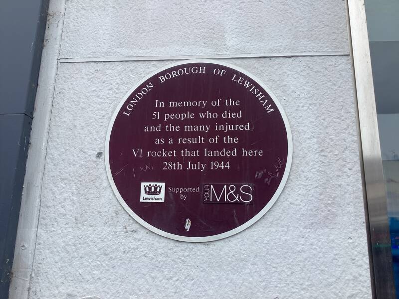 The worst V1 attack on South London. The rocket struck the busy street market at 09.41 on a Friday morning. Numbers reported vary, but about 52 people were killed and 124 very seriously injured. The force of the blast destroyed shops on both sides of the High Street.