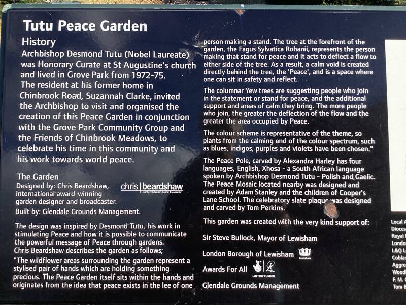 Desmond Tutu is associated with Grove Park, London, because he lived there from 1972 to 1975 while serving as a curate at St. Augustine's Church. A dedicated Peace Garden and Peace Trail were established at Chinbrook Meadows in 2009 to honor his legacy. The garden was opened by Tutu himself in 2009 and is a space for community and reflection