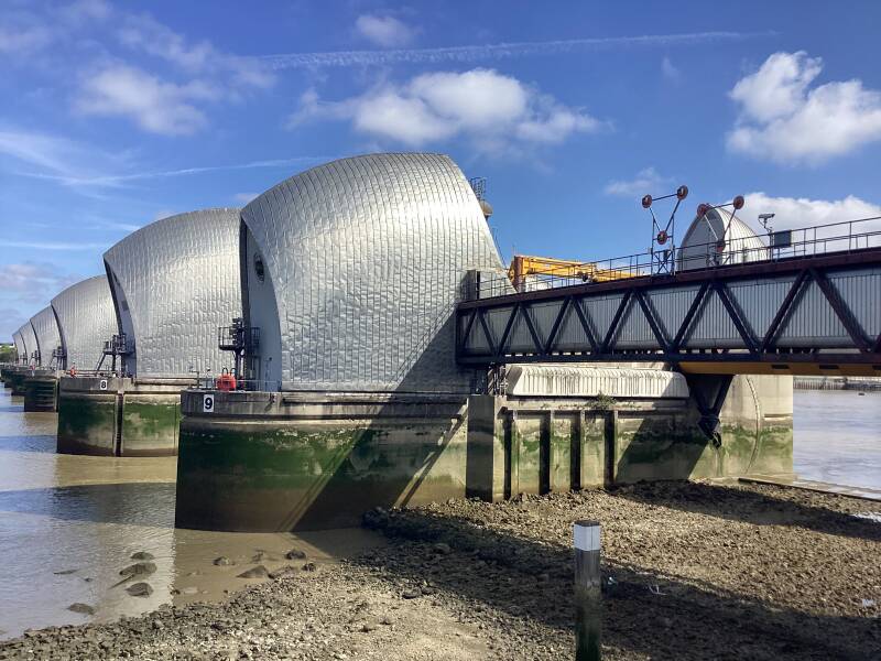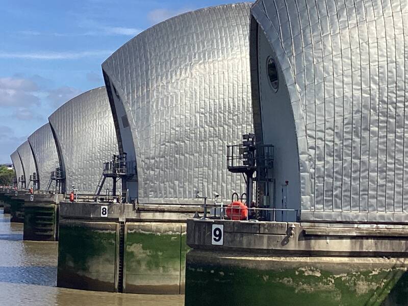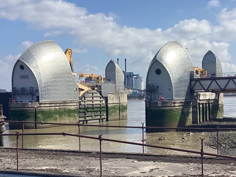 The world’s largest movable flood barrier, 520 m. wide. Commenced in 1972, completed in 1982, first used in 1983. Designed by RENDEL,PALMER & TRITTON, for the GLC. An imaginative use of structural steel and concrete, for which it has won awards, An outstanding engineering project, becoming a permanent London landmark.