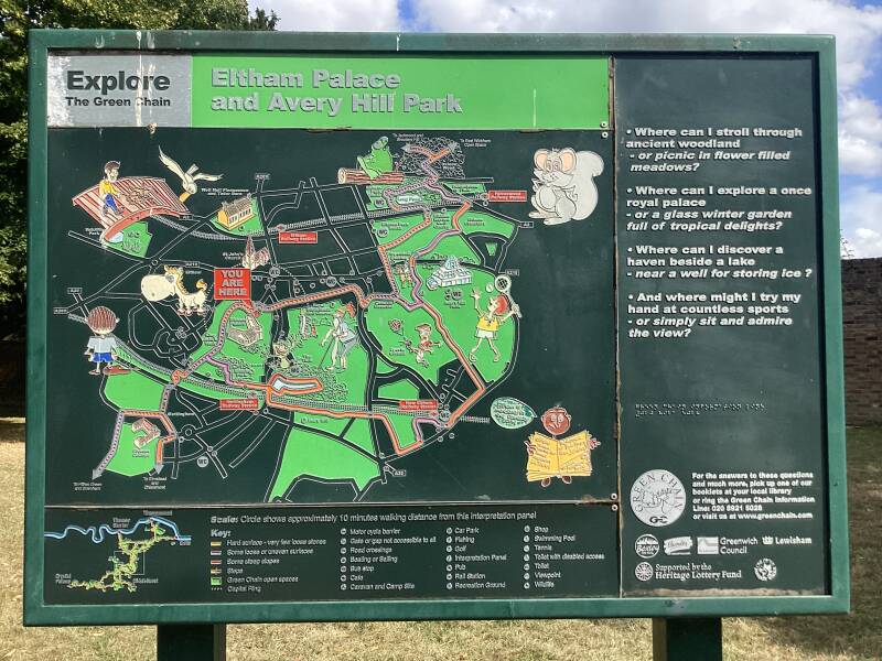 With the grand rebuilding of Greenwich Palace, which was more easily reached by river,[6] Eltham was less frequented (and the STUARTSpreferred the riverside palace of Greenwich and neglected Eltham) save for the hunting in its enclosed parks, easily reached from Greenwich, "as well enjoyed, the Court lying at Greenwiche, as if it were at this house it self". The deer remained plentiful in the Great Park, of 596 acres (2.4 km2), the Little, or Middle Park, of 333 acres (1.3 km2), and the Home Park, or Lee Park, of 336 acres (1.4 km2).[7]